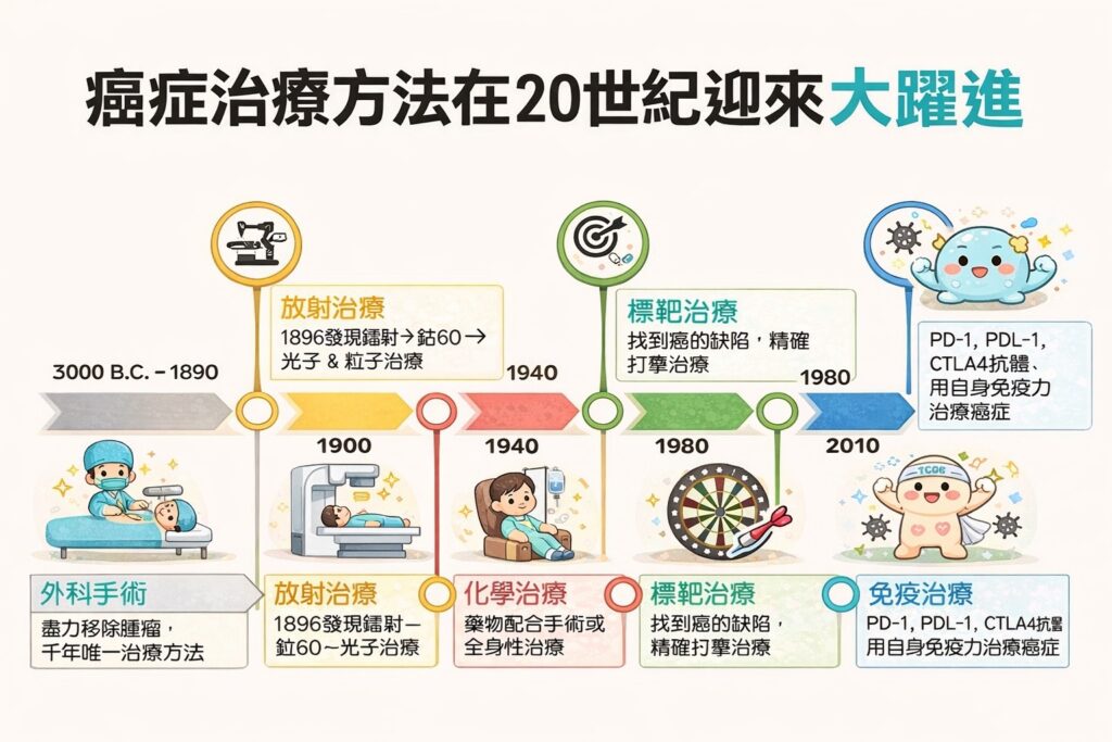 - 百年醫療演進:人類對抗癌症已從千年前唯一的外科手術,進步到 20 世紀的放化療與標靶治療。