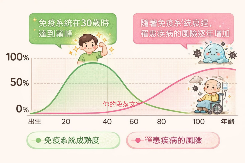 免疫力的不可逆:人體免疫力在 20 歲達到巔峰,到了 40 歲僅剩巔峰期的一半,這也是疾病發生率隨年齡激增的主因 。
