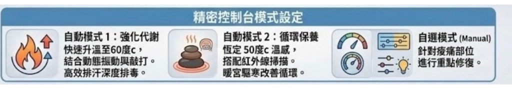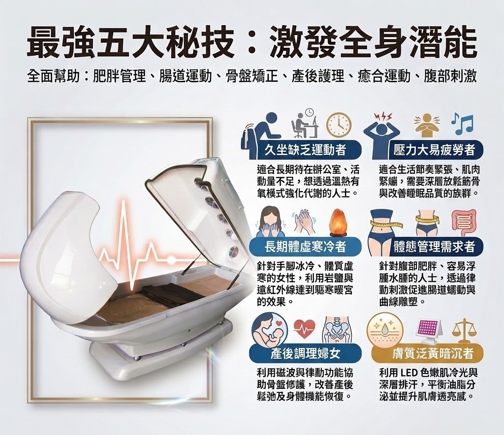 特殊瓷石溫熱療法,熱能直達深層組織,如同在艙內進行「有氧運動」,幫助血管擴張並加快代謝速度。