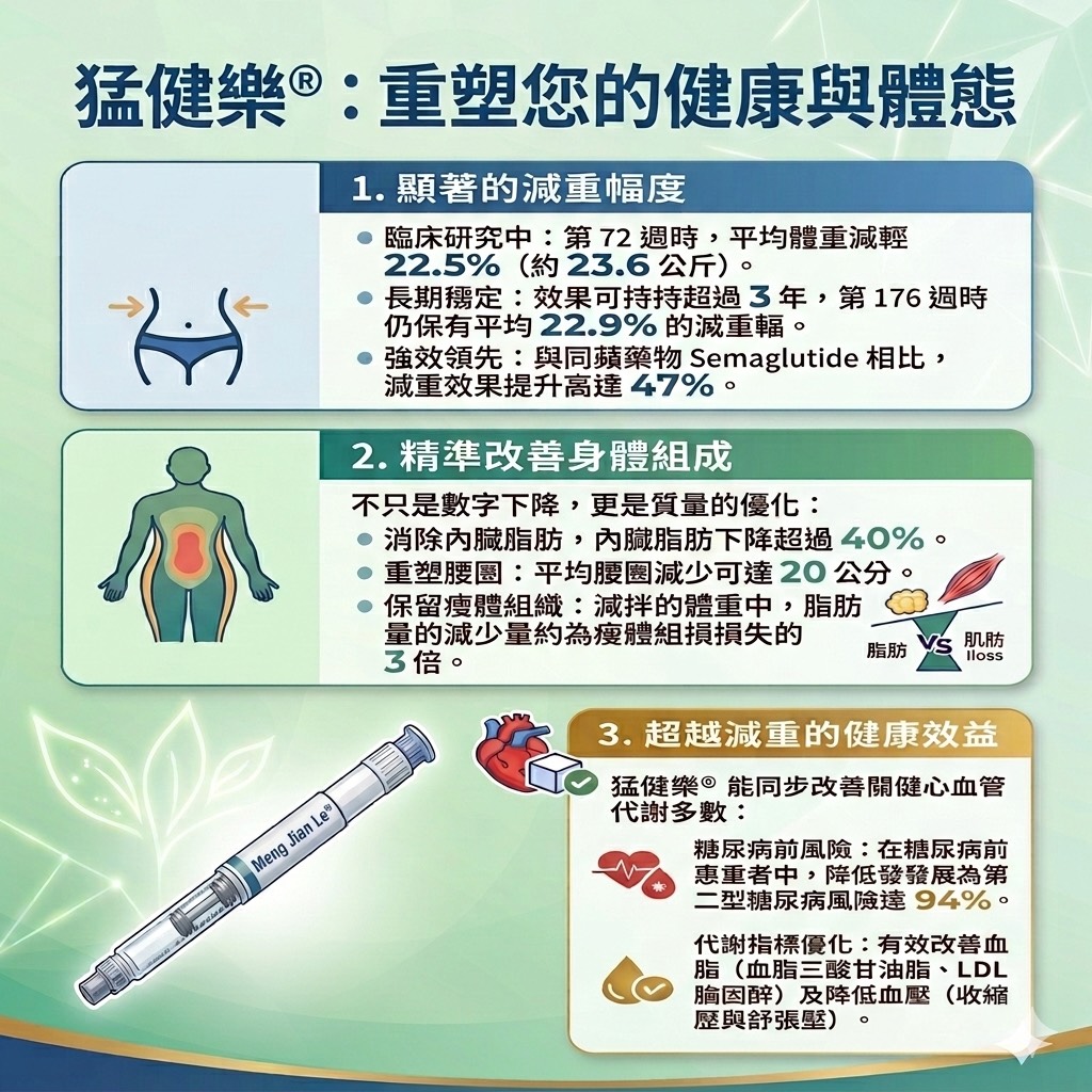 在臨床研究中,使用猛健樂® 15 mg 的患者,於第 72 週時平均體重減輕達 22.5%(約 23.6 公斤)。