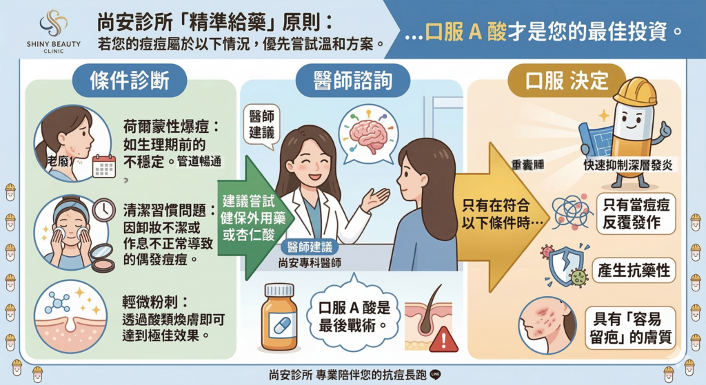 在尚安診所,我們堅持「精準給藥」。若您的痘痘屬於以下情況,醫師會優先建議您嘗試更溫和的方案(如健保外用藥或杏仁酸):