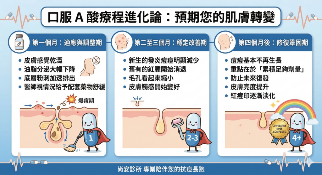 服用口服 A 酸是一場長跑,了解每個階段的變化能讓患者更安心: