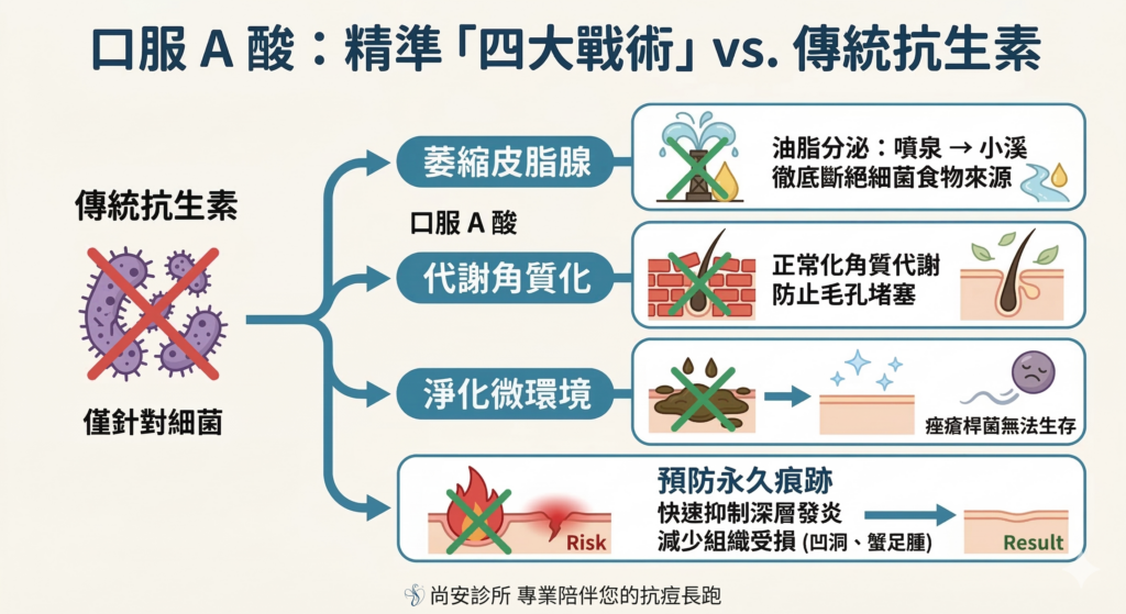 萎縮皮脂腺: 直接縮小腺體,讓油脂分泌從「噴泉」轉為「小溪」,徹底斷絕細菌的食物來源。