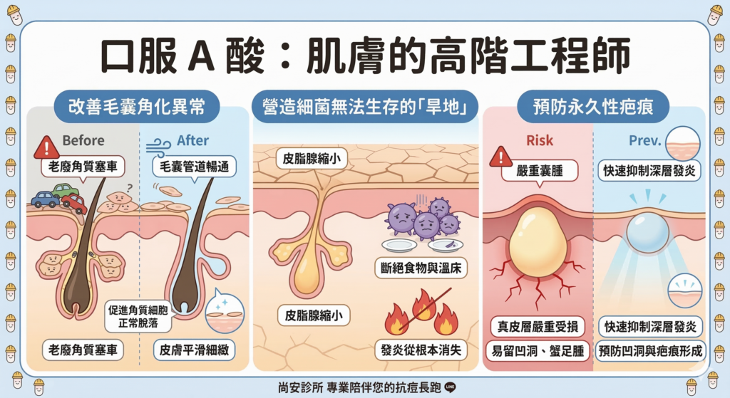 口服 A 酸不只是「強效控油」,它更像是一位皮膚的「高階工程師」,從微觀層面重新調整肌膚的生理環境: