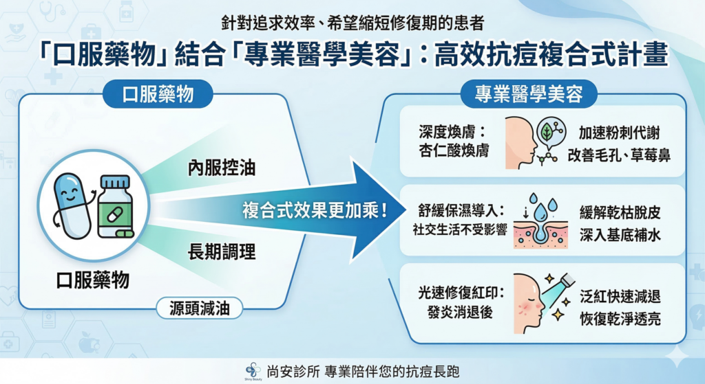 治療初期若遇「爆痘期」請別擔心,這是藥物代謝的正常過程。為了縮短尷尬期並預防痘疤,建議搭配複合式療程: