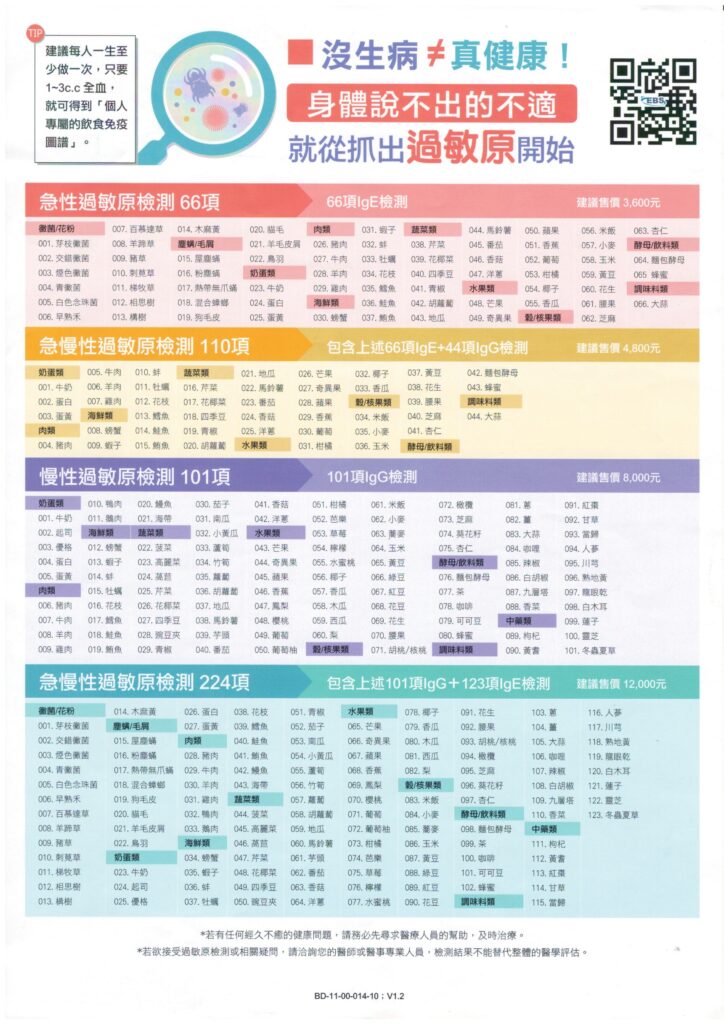 110項: 包含 66 項 IgE (急性) + 44 項 IgG (慢性) 檢測。