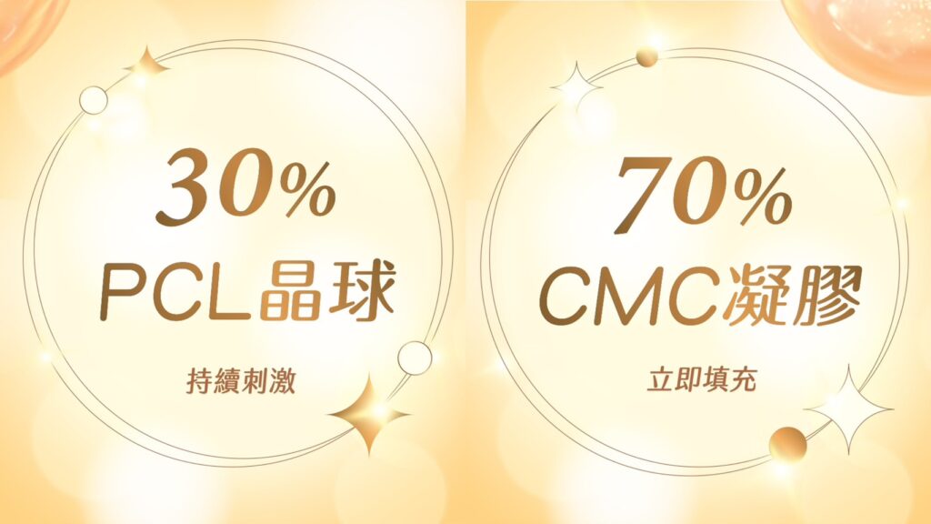 30% PCL 微型晶球(持續刺激): PCL 晶球會均勻分佈在皮膚深層,形成支撐支架,持續刺激自體膠原蛋白再生,當 CMC 凝膠被吸收時,新生的膠原蛋白已完美接棒。