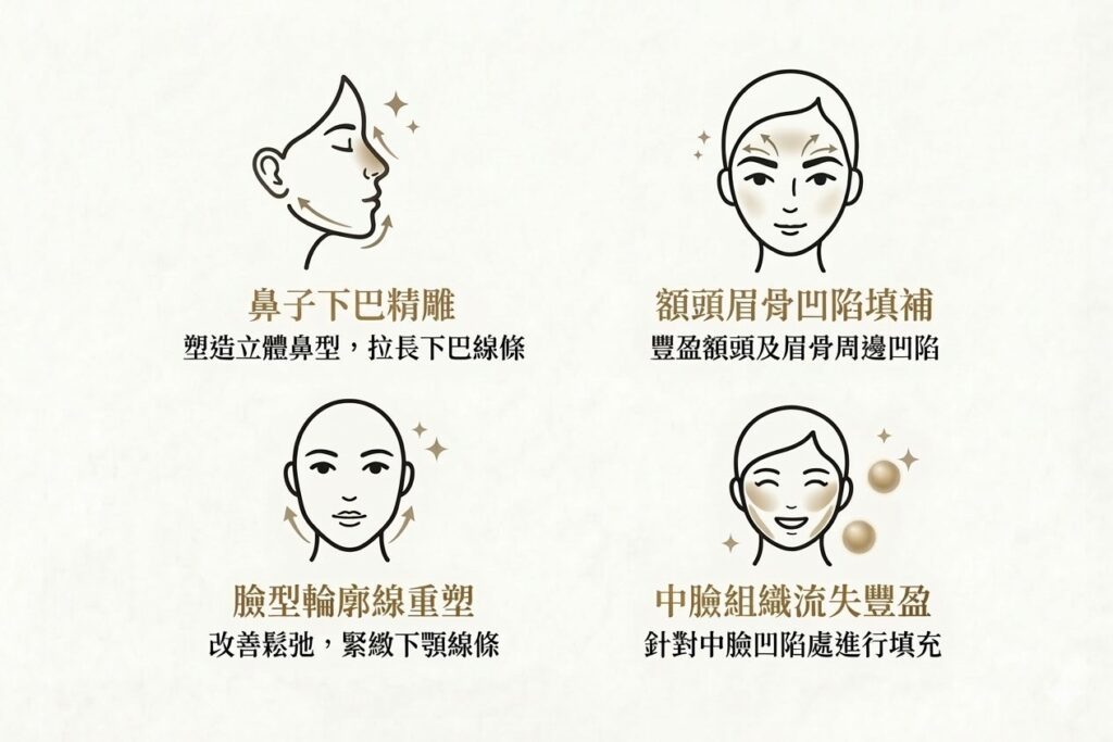 - 結構重建重點: 眉骨、鼻子、下巴、額頭與太陽穴,適合需要高度支撐、擬真骨骼感的部位。