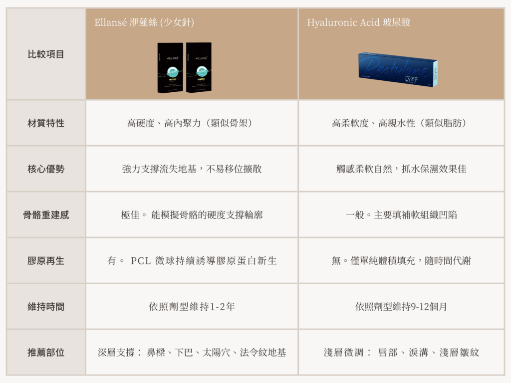 ▍再生醫美比較:洢蓮絲® vs. 玻尿酸 — 材質硬度與骨骼重建的關鍵