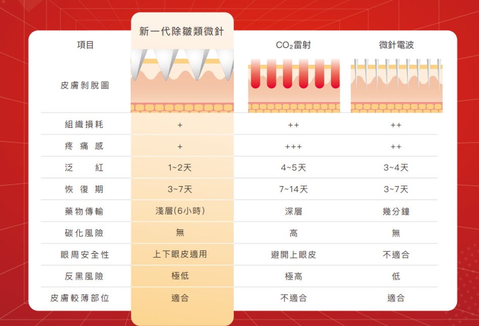 熱力點陣技術: 由於通道維持時間長,藥物吸收效果更佳 。且專利鈦合金探頭具備乾熱滅菌特性,無交叉感染疑慮,安全性極高 。