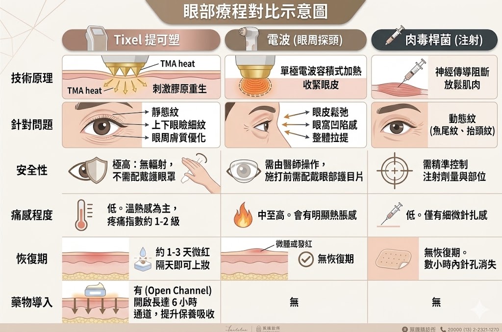 針對眼周除皺,Tixel 提可塑、電波眼周探頭與肉毒桿菌是目前市場上最主流的三種方案 。提可塑以其獨特的「熱力點陣」技術,在安全性與藥物傳輸上具有顯著優點