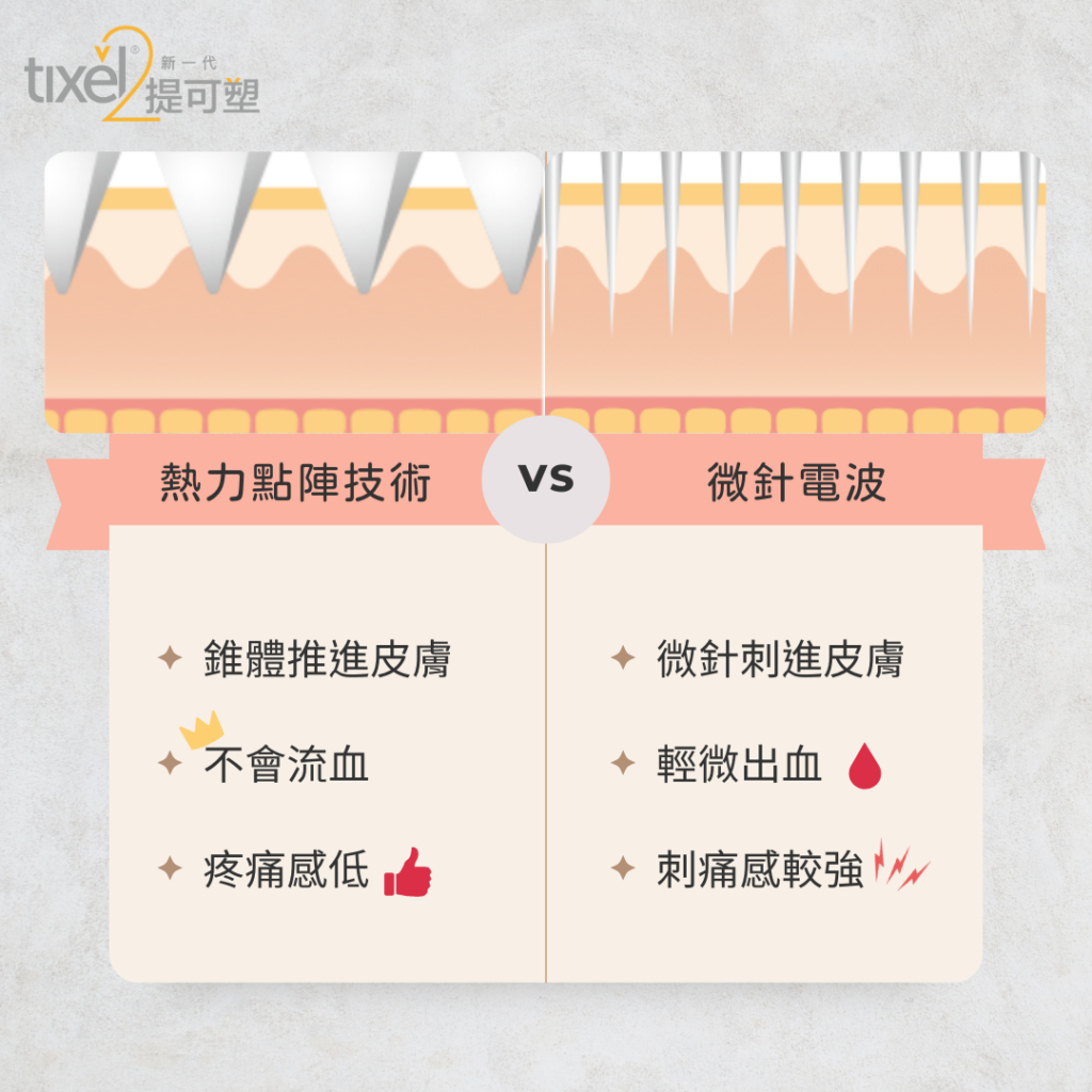 在進行痘疤或膚質重建治療時,除了儀器本身的能量,術後能否有效導入修復藥物也是關鍵。提可塑採用的 TMA 熱力點陣技術 與傳統 微針電波 在藥物傳輸上具有顯著的差異: