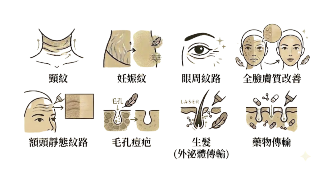 - 舒適體驗: 探頭設計分散了痛感,術後僅有輕微紅腫,且不產生傳統雷射可能留下的點狀傷口 。