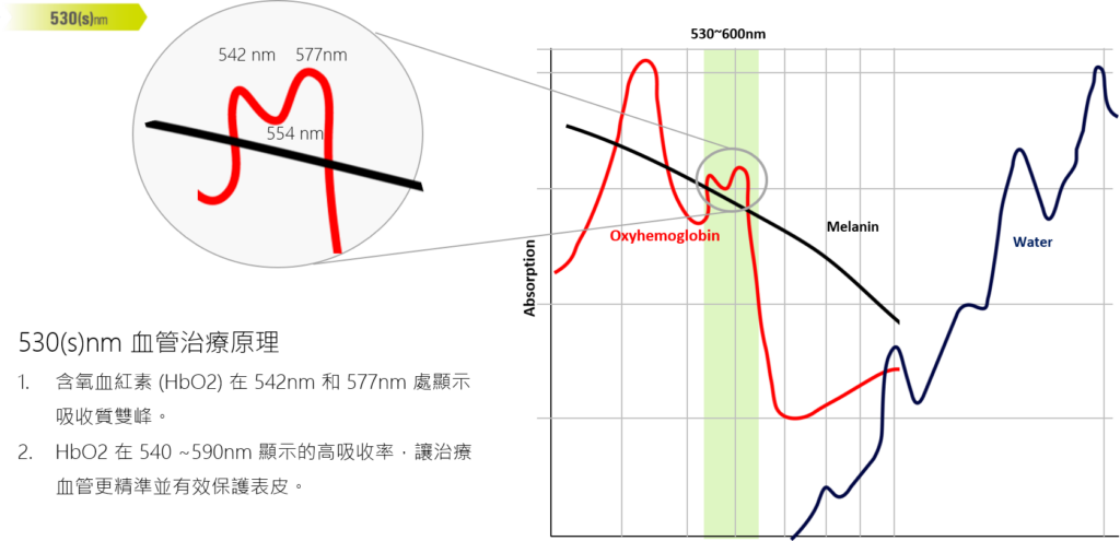 - 500(S)nm、530(S)nm、530(D)nm、550(S)nm:針對不同深度的血管病變、微血管擴張或面部泛紅進行精準退紅。