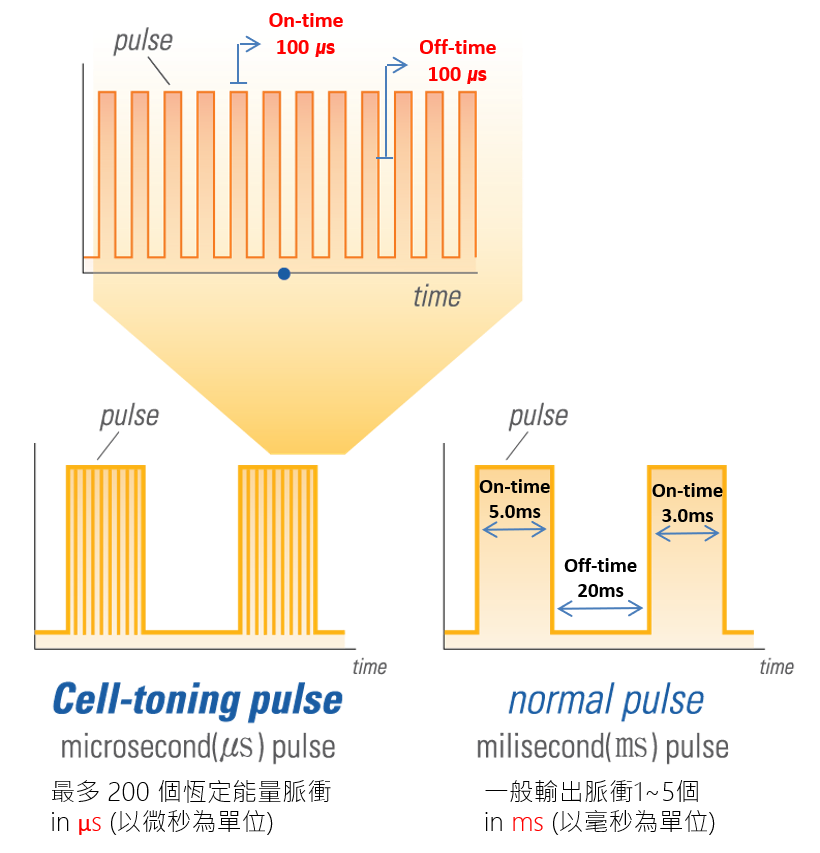Cellec V 的 Cell-Toning 模式以 微秒脈衝 式輸出能量,具備極低熱刺激的特性。